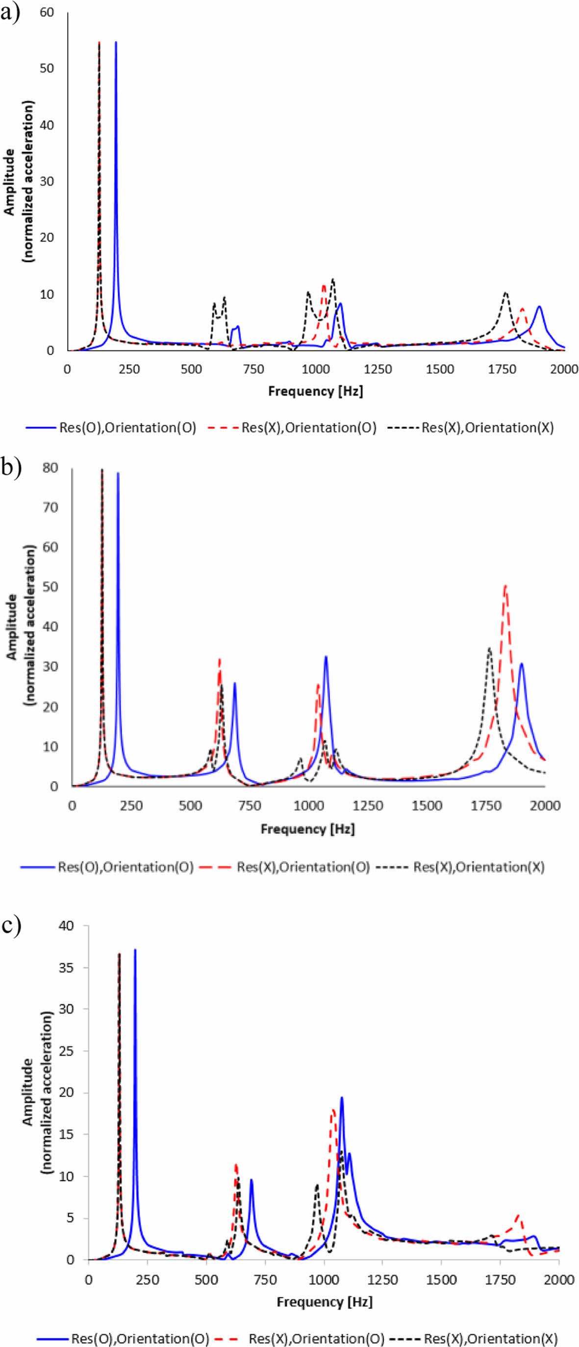 앞서 정의한 유한요소 모델에 진동해석 실시하여 섬유 배향과 잔류응력의 유무에 따른 modal 값과 동적 응답을 검토했다. Modal 해석을 선행적으로 실시하고 추출된 modal 값들을 기반으로 주파수 응답 해석을 수행했다. 여기서 외력으로 Z방향으로 5G 가속도를 부여했다. 결과적으로 주파수 응답 함수(FRF: Frequency response function)을 2000(Hz) 범위 내에서 획득할 수 있었다. 잔류응력을 반영하기 위해 ABAQUS의 Predifine field를 이용하였고 이 잔류응력 값들이 평형 상태로 도달하기 위해 modal 해석 전에 외력이 없는 정해석을 실시했다[14]. 해석 대조군으로 섬유 배향과 잔류응력을 모두 고려하지 않은 경우와 섬유 배향은 그대로 적용하고 잔류응력만 제한한 경우를 고려하여 총 세 종류의 해석을 실시했다. 반면, 물성치, 경계 조건, 외력 등 모든 조건은 세 가지 해석에 동등하게 적용했다.