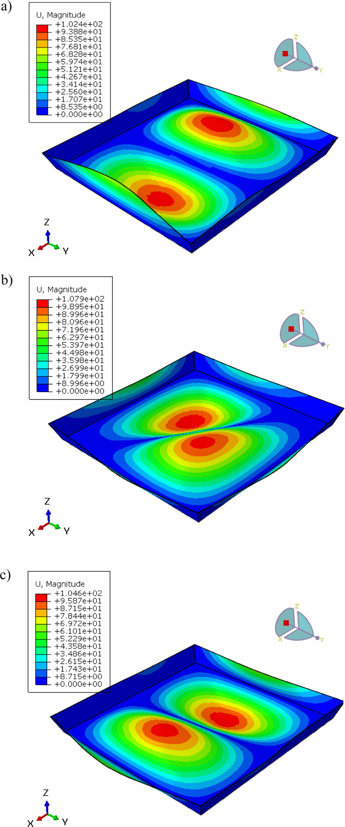 Fig. 12 Mode shapes at the 3rd mode; a) with both residual and fiber orientation considered, b) without residual stress but with fiber orientation considered, and c) without both residual and fiber orientation considered |