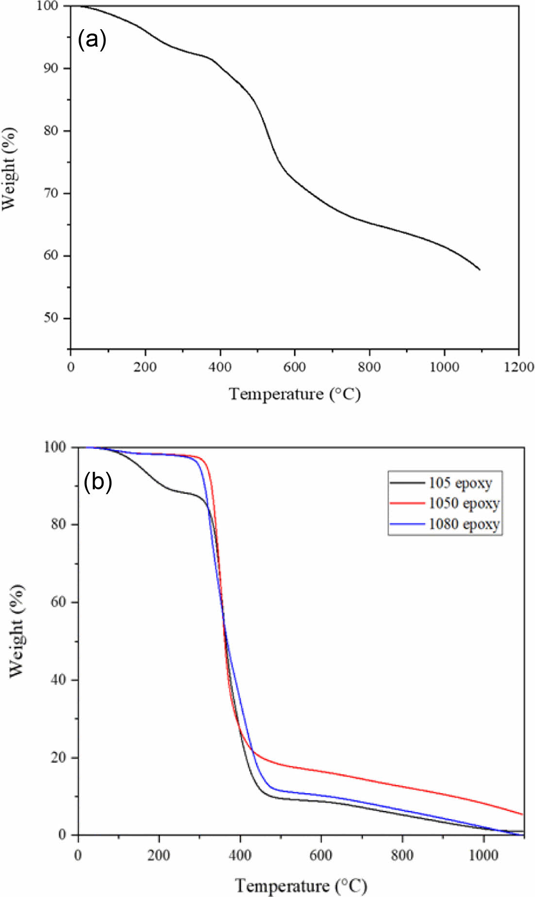 Fig. 1 TGA results of (a) KRD-HM2 (Kolon Industry) phenol resin and (b) various epoxy resin (Resoltech 105, 1050, 1080) upto 1000oC in nitrogen |