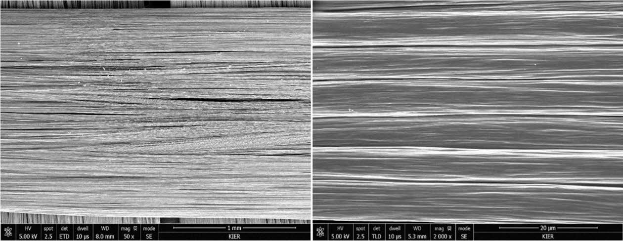 Fig. 1의 페놀 수지 열분석 결과와 같이 1000oC에서 약 50 wt% 이상의 탄화 수율로 잔탄률이 매우 높아 C/C 제조 시 우수한 모재가 이미 다량 존재하고 있어 우수한 치밀화도 확보가 가능 할 것으로 판단된다. 또한, Fig. 2와 같이 탄화 후 표면에 잔탄층이 존재하며, 탄화 수축 균열사이로 탄소섬유가 확인되었다. 반면, Fig. 1의 에폭시 수지 열분석 결과와 같이 5% 이내의 매우 낮은 탄화 수율을 보이며, SEM 분석 결과 Fig. 3과 같이 탄화 공정 후 잔탄 성분이 전혀 확인되지 않고, 탄소섬유만 존재하는 것을 확인 할 수 있었다.