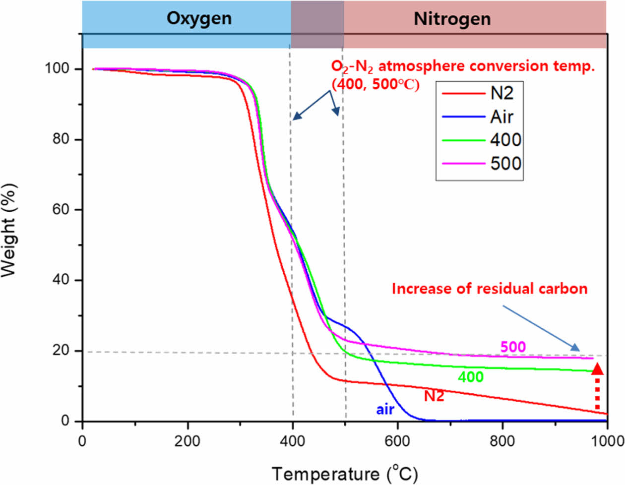 고분자를 공기 분위기 탄화 시 에폭시 수지의 경우 Fig. 4의 “Air”와 같이 600oC에서 산화되어 탄소가 전혀 남지 않는다. 또한, 질소에서 탄화 시 Fig. 4의 “N2”와 같이 1~2% 수준의 매우 낮은 탄화 수율을 보인다. 반면, 산화-불활성 분위기 제어를 통한 열처리의 경우 Fig. 4와 같이 400oC에서 변환하거나, 500oC에서 변환한 경우 질소 분위기에 비교하여 잔탄률이 각각 17%, 19%로 상당히 향상된 것을 확인 할 수 있었다.