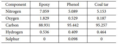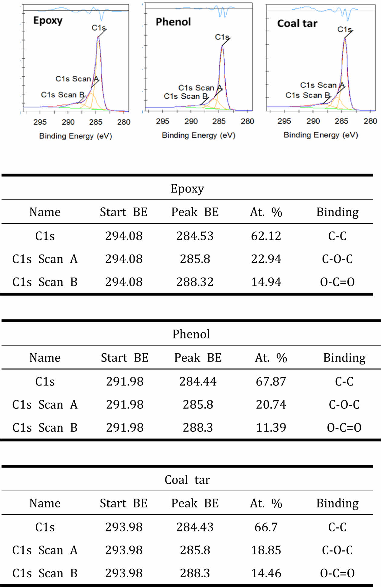 분위기 제어를 통해 확보한 에폭시 수지의 잔탄성분에 대한 EA 분석결과를 Table 2에 나타내었다. Phenol, Coal tar 소재의 탄소 및 산소 content는 매우 유사하였으며, Epoxy 소재는 상대적으로 산소 content가 높고 탄소 content가 낮은 것으로 나타났다. 또한, Epoxy 소재는 500oC 이후에 질소로 전환하였음에도 불구하고 질소 함량이 높은 것으로 보인다.