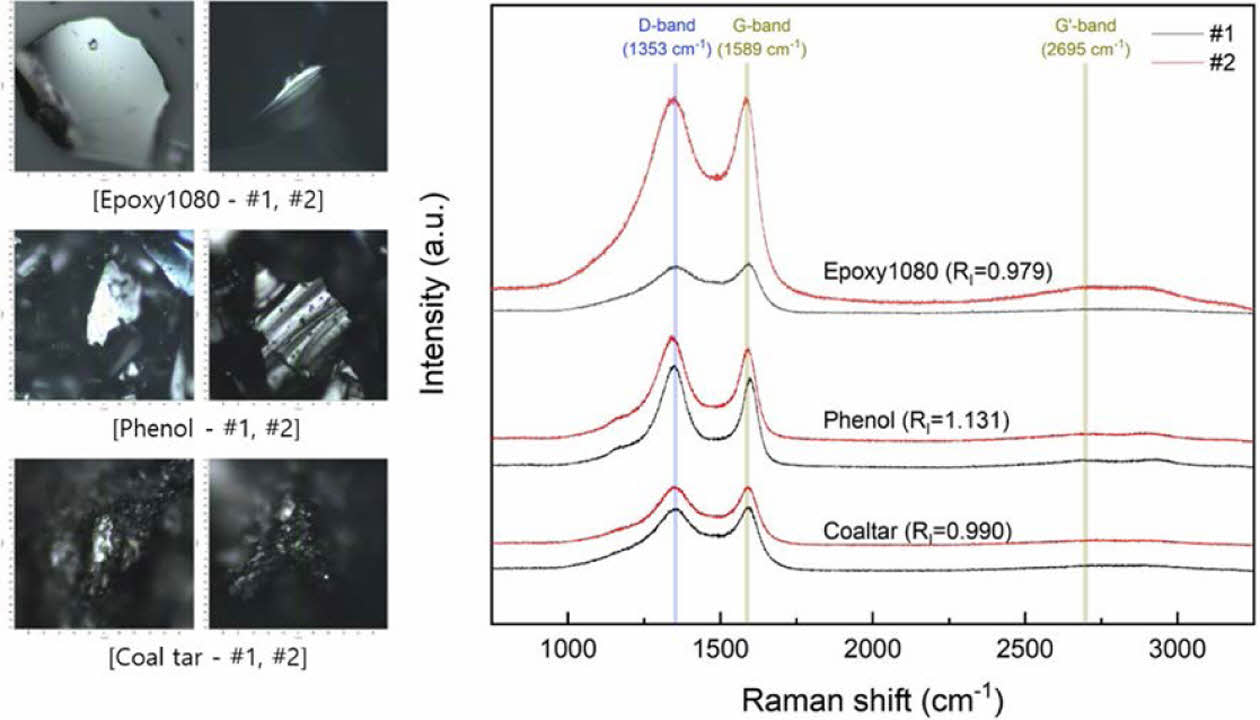 실험에 사용된 시료와 탄화 조건은 Epoxy (탄화조건: Air to 500oC + N2 to 1000oC), Phenol (탄화조건: N2 1000oC), Coal tar (탄화조건: N2 1000oC)이며, 탄화 후 확보한 잔탄에 대해 EA (Element analysis, C/H/O/N/S)를 이용한 원소 정량 분석, XPS (X-ray Photoelectron Spectroscopy)를 이용한 Carbon의 binding energy 분석 그리고 Raman spectroscopy를 이용한 carbon의 결정성 분석을 수행하였다. EA 분석의 경우 Flash 2000 모델을 사용하였으며, 분석 가능 원소는 C, H, N, S, O이고 측정 범위는 100 ppm~100%, 정확도 0.1~0.3, 연소온도 1800oC의 사양을 가진다.
