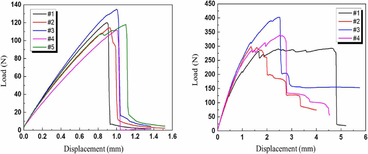 Fig. 8 Load - displacement curve of flexural strength test of C/C (Left: 25SW, Right: 25SR) |