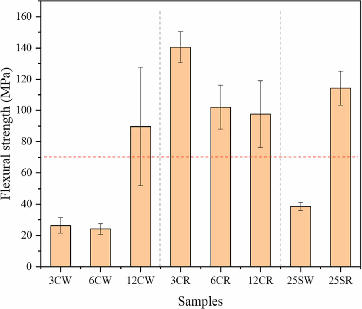 Fig. 8에 25SW와 25SR 시험편의 load - displacement 곡선 결과를 나타내었다. 25SW의 경우 최대하중 이후 균열이 발생하였을 경우 급격한 파손이 발생하며 파단에 이르는 파괴거동을 보이는 반면, 25SR의 경우 최대 하중 이후 균열 발생 이후에도 파괴 지연 효과가 나타나 섬유강화 복합소재로서의 인성을 충분히 지닌 것으로 판단된다. Fig. 9에는 본 연구에서 제조된 8종류의 시험편 굽힘강도를 나타내었다. 시험결과, W계열 시험편은 섬유의 길이가 12 mm 이상의 경우에 70 MPa 이상의 우수한 기계적 특성을 보였으나, 굽힘강도의 편차가 크게 나타나 신뢰성 있는 소재로 판단하기 어렵다. 반면, R계열 시험편의 경우 섬유의 길이가 길수록 점차 기계적 특성이 낮아지는 경향을 보이며, 30 mm의 섬유를 이용한 프리폼을 적용할 경우 약 140 MPa의 매우 우수한 굽힘 강도 결과를 보인다. 또한, 강도의 편차 역시 상대적으로 낮아 향후 공정 개선을 통해 매우 우수한 신뢰성을 확보한 소재 제작이 가능할 것으로 판단된다.