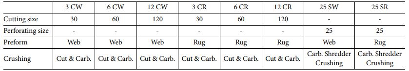 폐 CFRP는 상기에 기술한 산화-불활성 분위기 변환 열처리 공정(탄화조건: Air to 500oC + N2 to 1000oC)을 통해 탄화되었으며, 이를 활용한 C/C 제조 공정 연구를 수행하였다. 폐 CFRP의 탄소섬유를 재활용하기 위해 FRP또는 탄화체의 파쇄는 필수적이다. 장섬유 상태로의 재활용은 일정한 품질의 제품 생산이 불가능하므로, 파쇄를 통한 단섬유화 공정 연구가 수행되었다. 파쇄는 shear, press, friction 및 impact에 의한 공정이며, 본 연구에서는 슈레더(Shredder)와 컷크러셔(Cut Crusher)를 적용하였다. Shredder를 적용하여 폐CFRP를 파쇄한 후 Cut Crusher를 적용하여 응집체를 분산시키고, 미분화하며 섬유질 재료를 풀어헤치는 공정을 수행하였다.