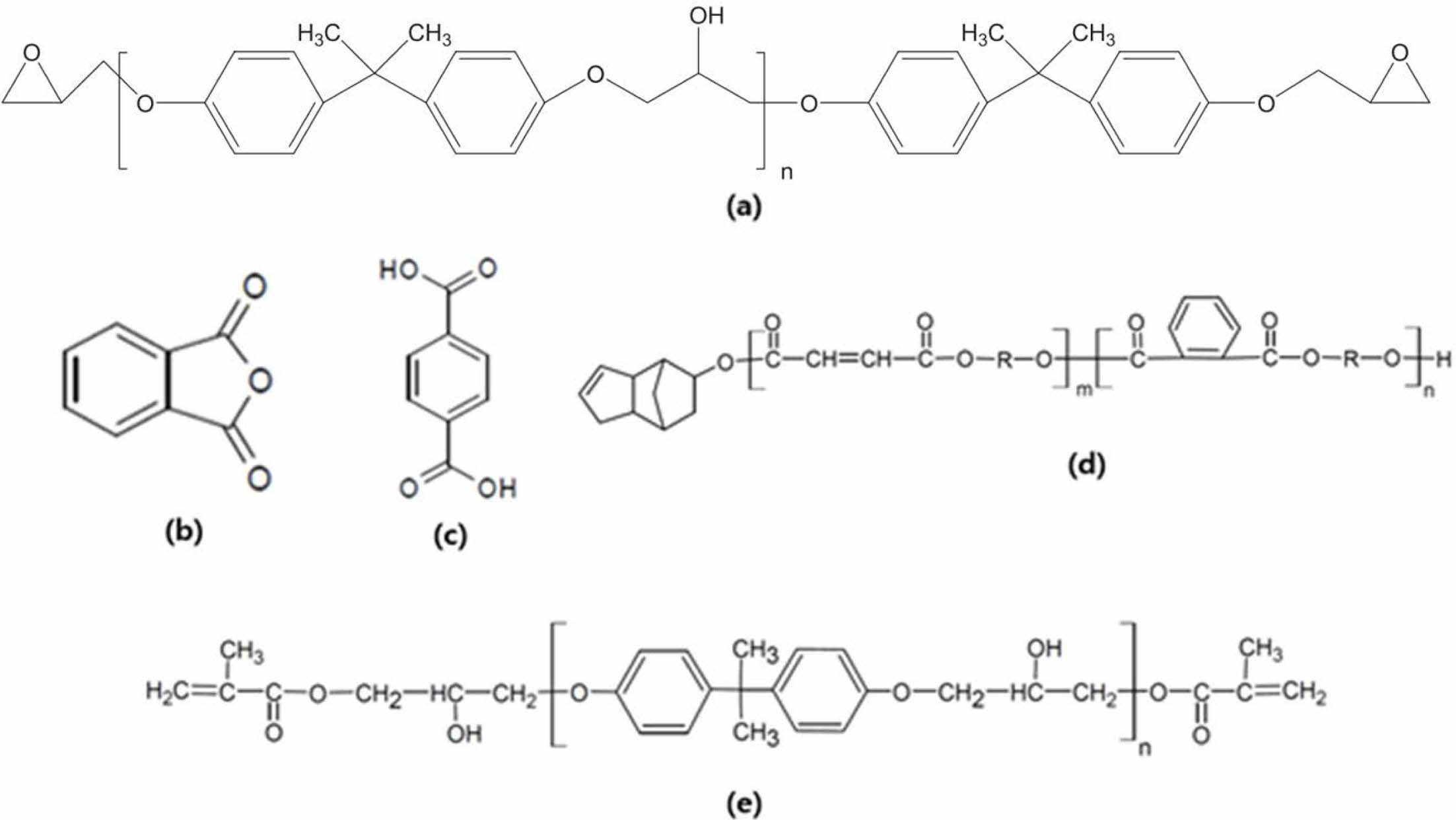 Fig. 1 (a) BPA Epoxy, (b) Ortho type UP, (c) Tere type UP, (d) DCPD type UP, (e) BPA VE |