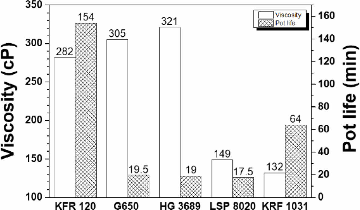 수지의 점도와 가사시간은 Infusion 공법으로 대형부품을 제작할 때 가장 먼저 고려되어야 하는 조건이다. 수지의 점도가 낮을수록 함침 속도가 빨라 지기 때문에 수지 주입에 필요한 시간이 감소한다. 수지의 가사시간이 짧으면 수지가 모두 주입되기 전에 수지의 점도가 상승하거나 경화되어 주입이 완료되지 않을 수 있다. 반대로 가사시간이 너무 길면 제품의 생산성이 떨어진다. 따라서 수지들의 점도와 가사시간을 측정하여 결과를 종합하면 어떤 수지가 대형부품의 제조에 사용될 수 있는지 판단할 수 있다.