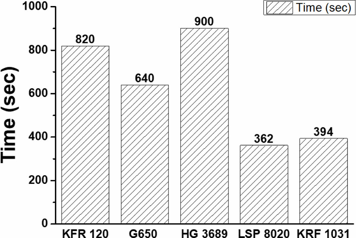 Fig. 3에서 5종의 수지들의 Infusion time이 6분~15분 사이로 다양하게 측정됨을 확인할 수 있다. LSP와 KRF처럼 점도가 낮은 수지들은 실제로 짧은 Infusion time을 지녔다. KFR은 긴 가사시간을 지녔음에도 점도가 높아 Infusion time이 길었으며 LSP는 가장 짧은 가사시간을 지녔음에도 점도가 낮아 짧은 Infusion time을 지녔다. 이번 Infusion 실험은 3 ply, 90 cm를 이동하는 실험이다. 실제 대형부품 공정에서 더 많은 ply와 긴 너비의 부품을 성형한다면 Infusion time이 길어질 수 있다. 그런 경우 G, HG, LSP처럼 가사시간이 짧은 수지들은 가사 시간이 가까워짐에 따라 나타나는 점도 상승으로 인해 Infusion time이 더 길어질 수 있으며 주입 도중 경화가 일어날 수도 있다. 가사시간을 고려했을 때 LSP 다음으로 짧은 Infusion time을 지닌 KRF가 성형에 적합한 수지로 판단된다.