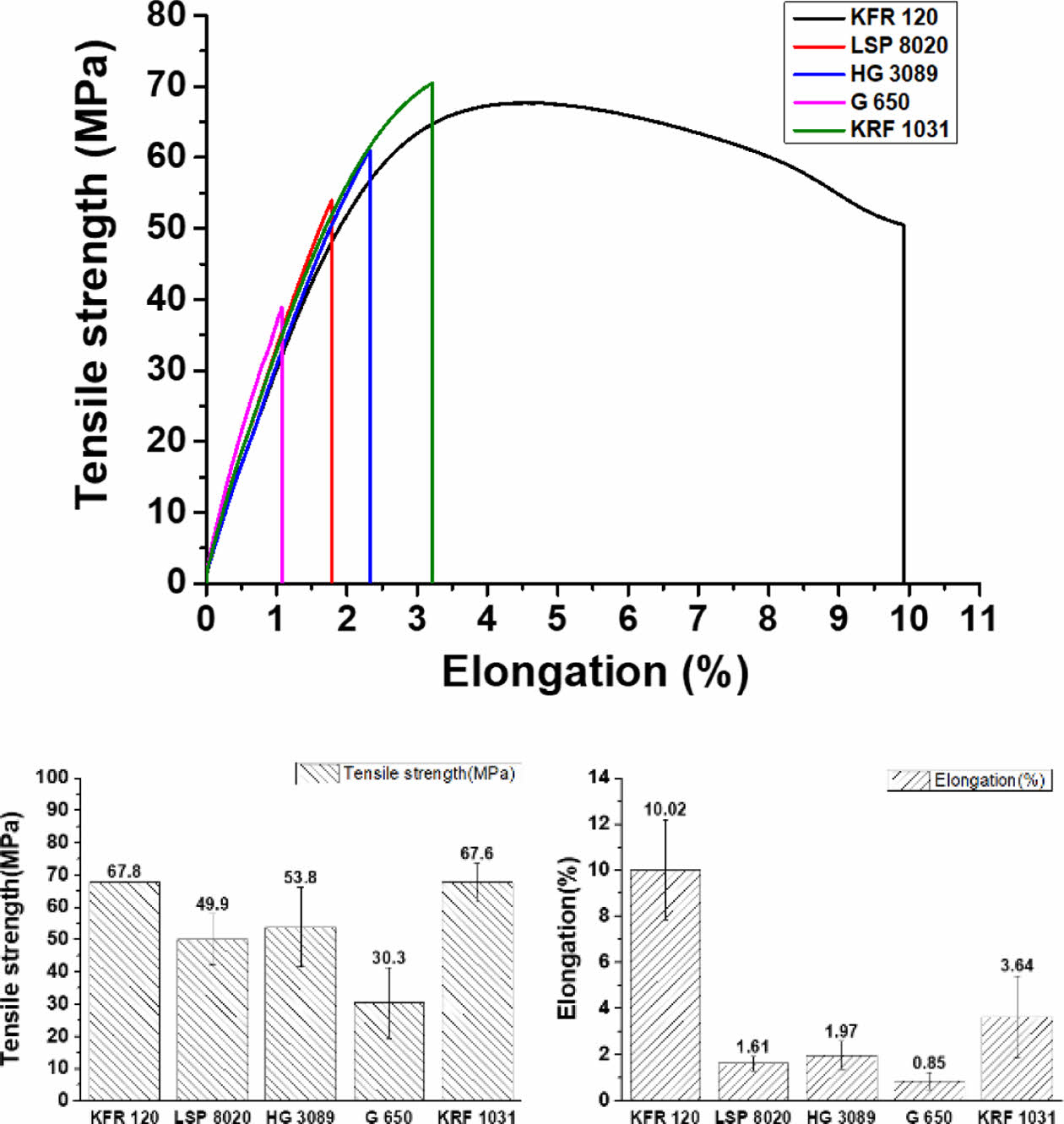 Fig. 4 Stress-Strain curve and tensile strength, elongation value of 5 different resins |
