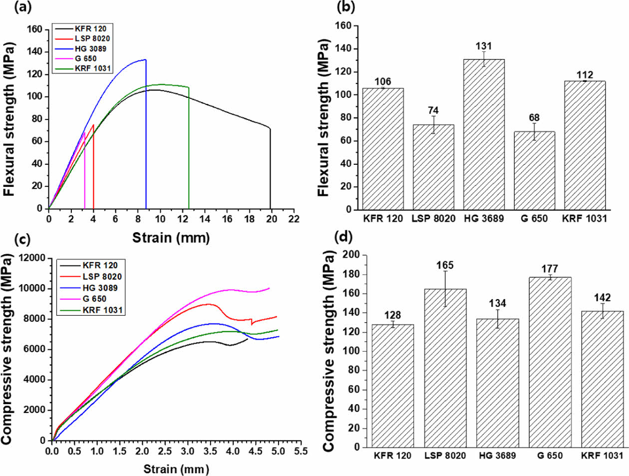 Fig. 5에서 수지들의 굴곡강도와 압축강도를 볼 수 있다. 인장실험에서 높은 인장강도가 나온 KRF와 KFR, HG는 상대적으로 높은 굴곡강도를 나타냈으며 낮은 인장강도를 지닌 LSP와 G는 낮은 굴곡강도를 나타냈다. 인장강도가 3번째로 강했던 HG가 KFR과 KRF를 제치고 가장 높은 굴곡강도를 보여줬다. 지나치게 brittle하여 낮은 파단신율을 가진 G, LSP는 굴곡강도를 제대로 받기전에 파괴되었고 ductile한 특성을 보이는 KFR과 KRF는 굴곡강도가 더 상승하지 못하고 strain이 높아졌다. Strain이 KFR, KRF보다 낮은 HG가 가장 높은 굴곡강도를 지닐 수 있는 것으로 해석된다.