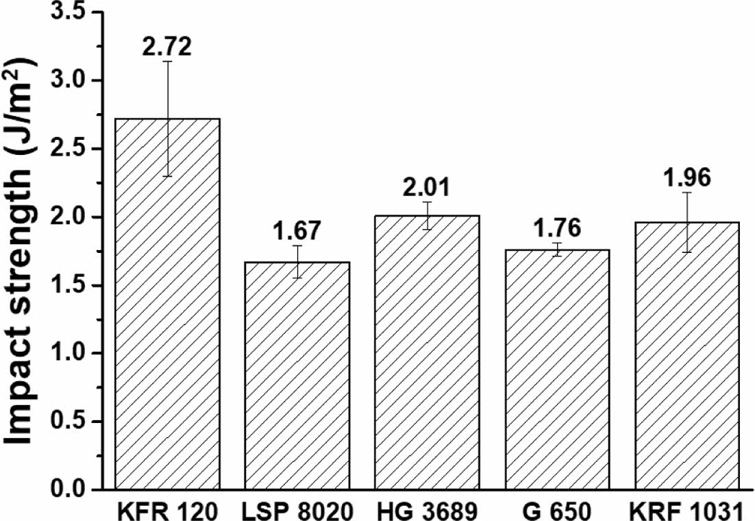 강도는 VE인 KRF가 EP인 KFR보다 높아 5종 수지 중 가장 높은 강도를 보였다. 3종의 UP중 가장 범용성이 좋은 UP인 G가 가장 낮은 강도와 파단신율을 보였으며 내열성을 향상시킨 LSP가 두번째로 낮은 강도와 파단신율을 보였다. 기계적 물성을 향상시킨 HG가 UP중 가장 높은 강도와 파단신율을 보였다.
