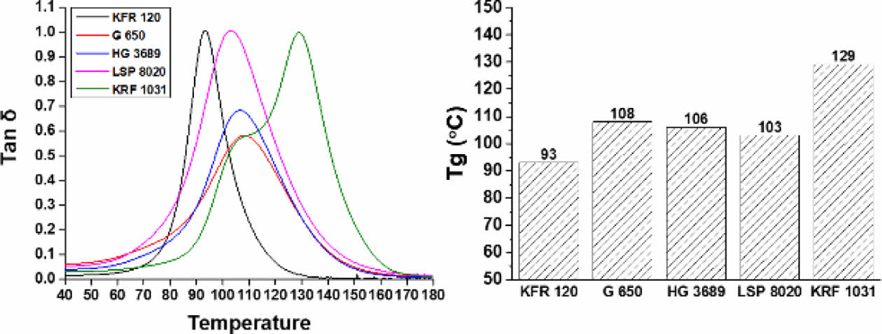 기계적 물성 외에 열적, 환경적 안정성을 파악하기 위하여 DMA 분석을 진행하였다. DMA 분석 결과 도출된 Tg 값을 Fig. 7에 그래프로 나타냈다. Tg 값은 VE인 KRF가 압도적으로 높게 나왔으며 그 뒤로 3종의 UP, Epoxy인 KFR이 가장 낮은 Tg 값을 보였다. 화재현장에서 사용되는 소화전 탱크의 특성상 높은 Tg 값은 탱크의 안정성에 도움이 된다. KRF가 실제 환경 시험을 시행했을 시 가장 안정적인 물성을 보일 것이라고 예측할 수 있다.