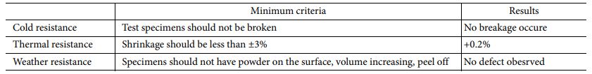 Table 1에서 각 실험의 결과를 확인할 수 있다. 탄소섬유/KRF 복합재 시편은 내한성, 내열성, 내후성 세가지 실험을 모두 통과하여 적용가능성을 증명하였다.