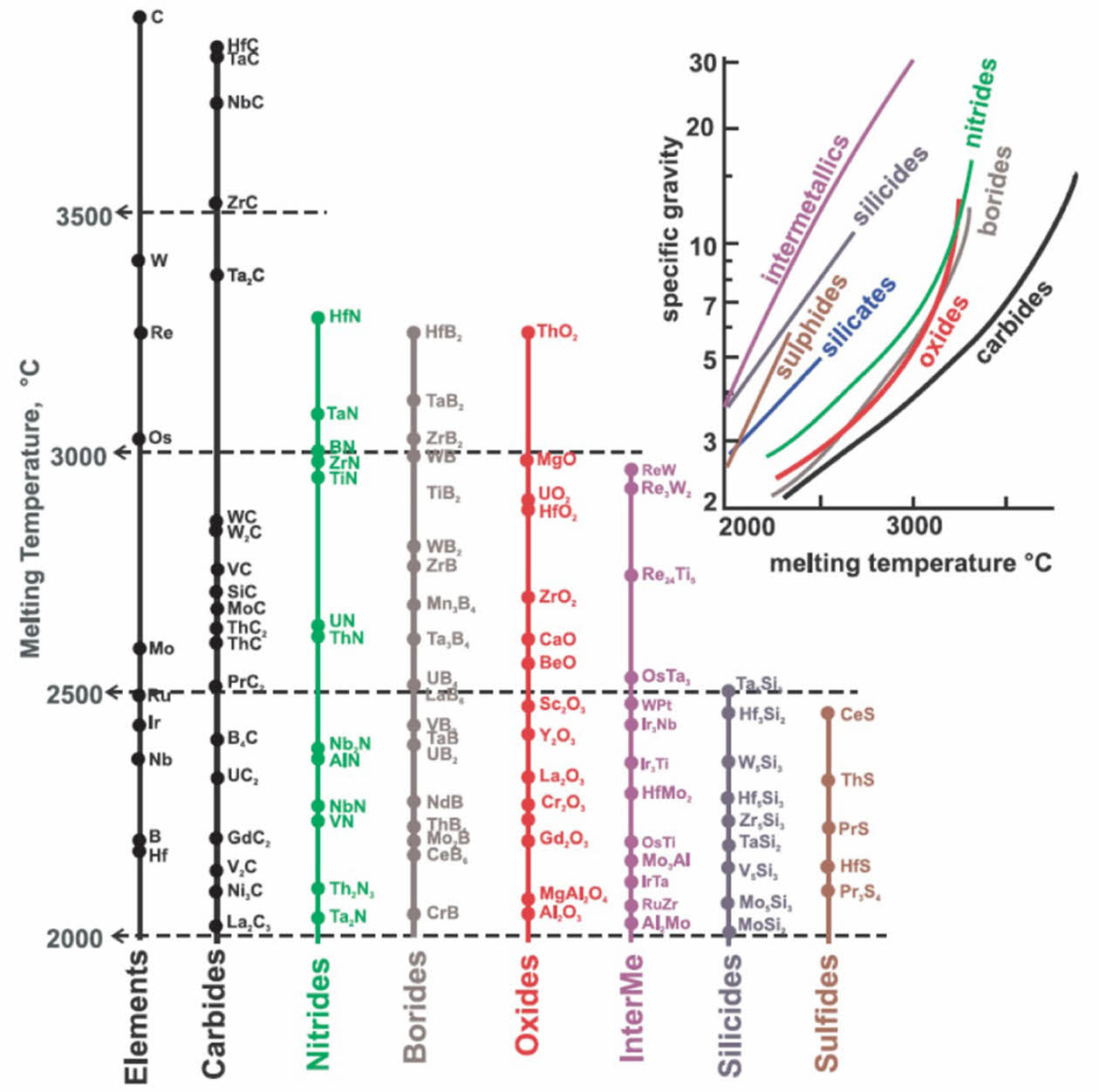 Fig. 2에 다양한 고융점 소재의 녹는점을 정리하였다. 단일상으로 높은 녹는점을 갖는 소재들로는 탄소와 텅스텐이 있고 탄화물 중 HfC, TaC 및 ZrC가 3,500oC 이상의 녹는점을 갖는다. 이외에 질화물, 붕화물, 산화물 등의 고융점 소재들은 3,300oC 이하의 녹는점을 갖는다. 이들 중 초고온 세라믹으로써 활발한 연구가 진행중인 소재들로는 ZrC, ZrB2, HfC, HfB2 및 SiC 등이 있다.