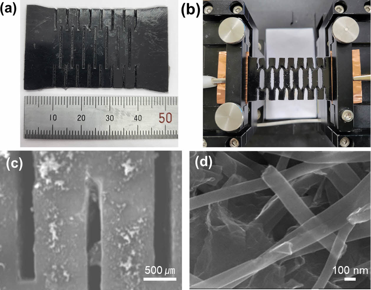Fig. 3(a)는 키리가미 패턴이 포함된 스트레인 센서의 모습으로, 설계에 따라 3D 프린팅으로 키리가미 패턴이 제작된 것을 확인하였다. Fig. 3(b)는 스트레인에 따른 센서의 저항 변화 측정 모습이다. SEM을 통해 코팅된 그래핀/탄소나노섬유 구조를 관찰하였다. Fig. 3(c, d)와 같이 센서의 표면에 그래핀과 탄소나노섬유가 고르게 분산되어 코팅된 것을 확인하였다. 특히, Fig. 3(d)의 고배율 SEM 이미지를 통해, 2차원 그래핀과 1차원 탄소나노섬유가 서로 고르게 접촉함으로써, 안정적이고 견고한 전도성 네트워크를 구성하는 것을 확인하였다.