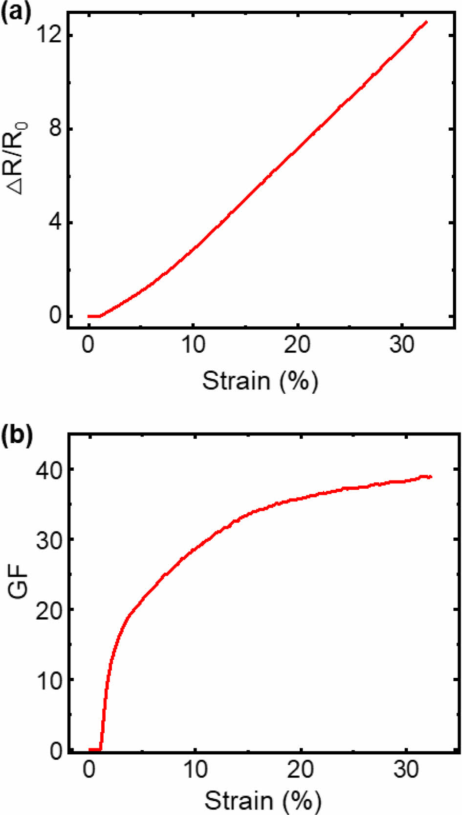 키리가미 패턴이 포함된 스트레인 센서의 성능을 평가하기 위하여, 스트레인에 따른 상대 저항 변화를 관찰하였다. 상대 저항 변화 비율(△R/R0)은 초기 저항(R0)에 대한 저항 변화(△R)의 비율을 나타낸다. Fig. 5(a)와 같이, 32%의 스트레인에서 △R/R0가 11.5까지 증가하였는데, 이를 통해 게이지팩터(gauge factor, GF)가 36까지 증가하는 것을 확인하였다(Fig. 5(b)).