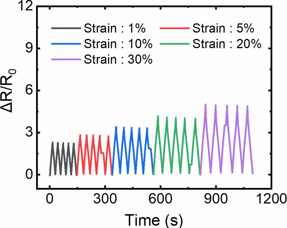 스트레인 센서에 대해 다양한 스트레인에 따른 응답 특성을 확인하였다. 스트레인을 1%에서 5%, 10%, 20%, 30%로 늘리면서 각 스트레인 별로 5회 반복 실험을 하였다. Fig. 6과 같이, 1%의 매우 낮은 스트레인에서도 안정적인 저항 변화 응답을 나타냈으며, 30% 스트레인까지 뚜렷하게 구별되는 센서 응답을 확인할 수 있다.