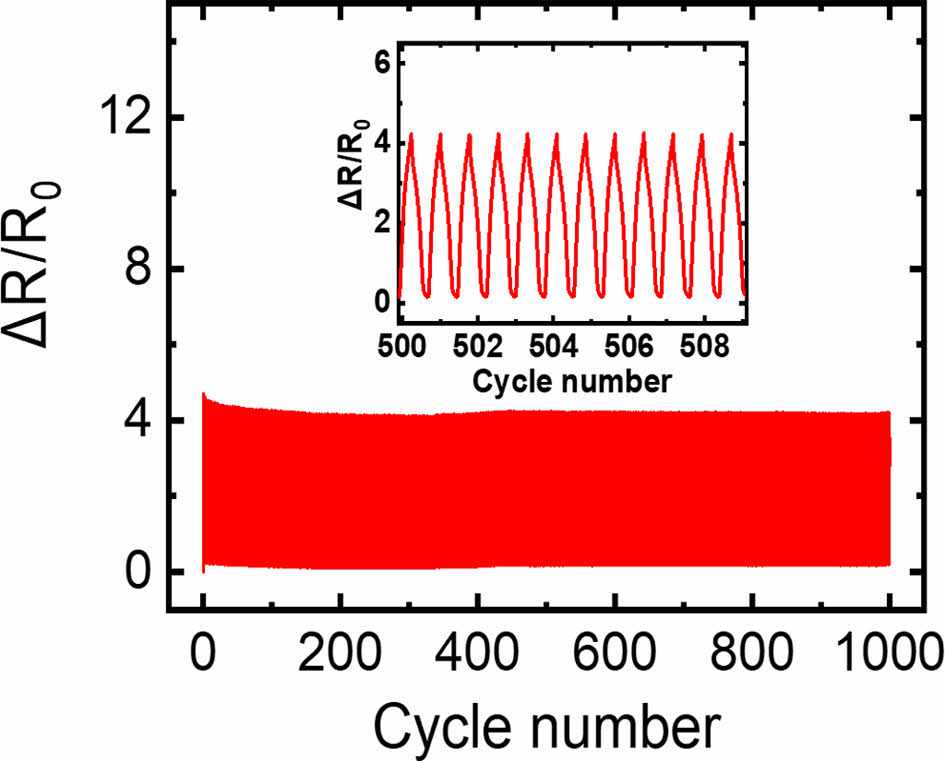 Fig. 7 Resistance-strain responses of the graphene/CNF-coated strain sensor with kirigami patterns under 1000 stretching-releasing cycles at a strain of 10% |