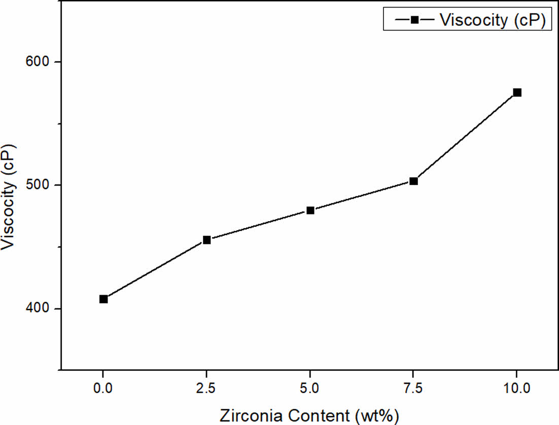 페놀수지에 zirconia를 혼합한 시료의 점도를 Fig. 1에 나타내었다. Zirconia의 함량이 증가할수록 점도가 높아지는 경향을 관찰할 수 있었다. 이러한 현상은 페놀수지와의 상용성이 비교적 떨어지는 zirconia 입자가 페놀수지 내에서 분산되면서 응집체를 형성하기 때문으로 사료된다. 이는 zirconia 함량이 증가하면서 페놀수지 내의 분산성이 떨어져 형성되는 것으로 판단된다. 형성된 응집체는 수지의 흐름성에 저항을 야기하고, 이에 따라 점도가 증가하는 것으로 추측된다.