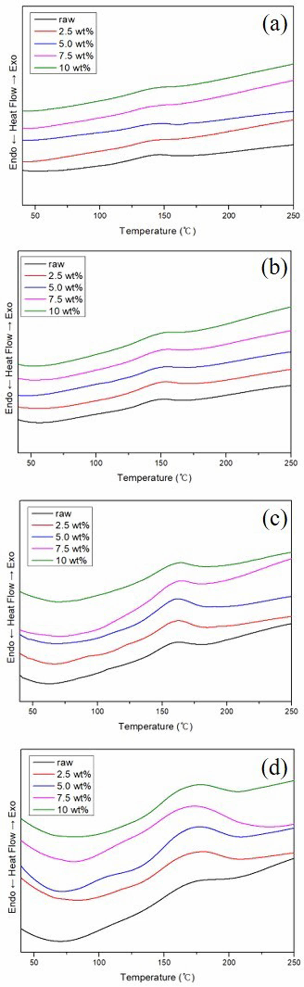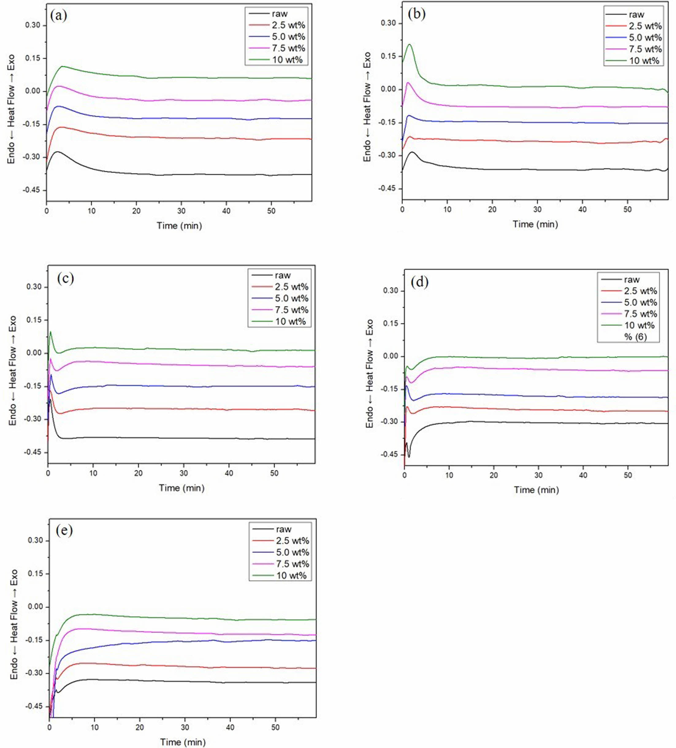 Fig. 8 Heat flows at different curing temperature with different zirconia content; (a) 140oC, (b) 150oC, (c) 160oC, (d) 170oC, (e) 180oC |