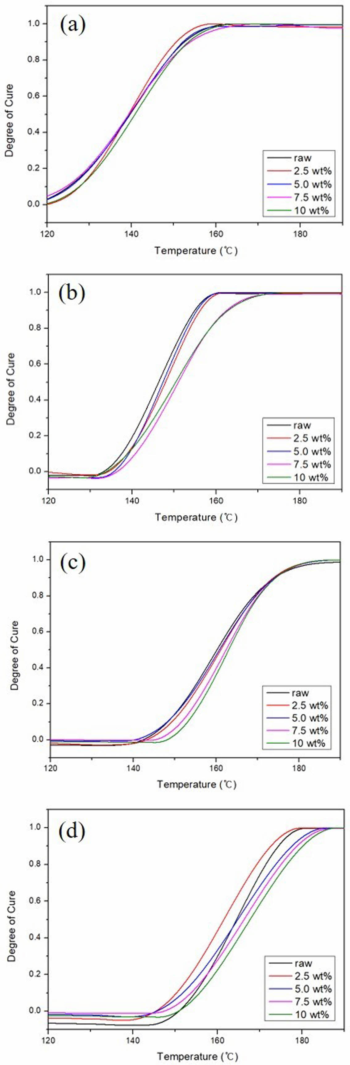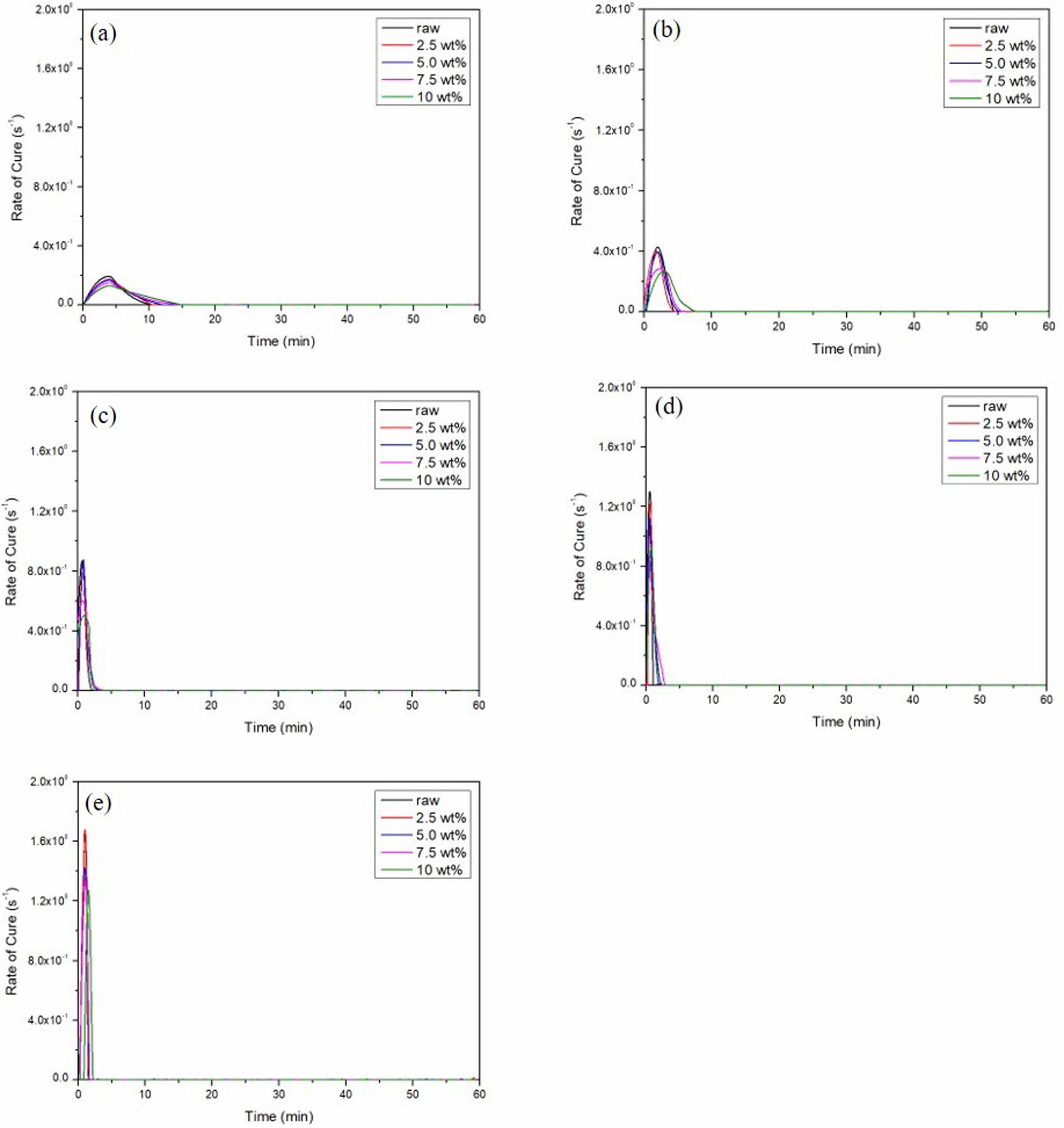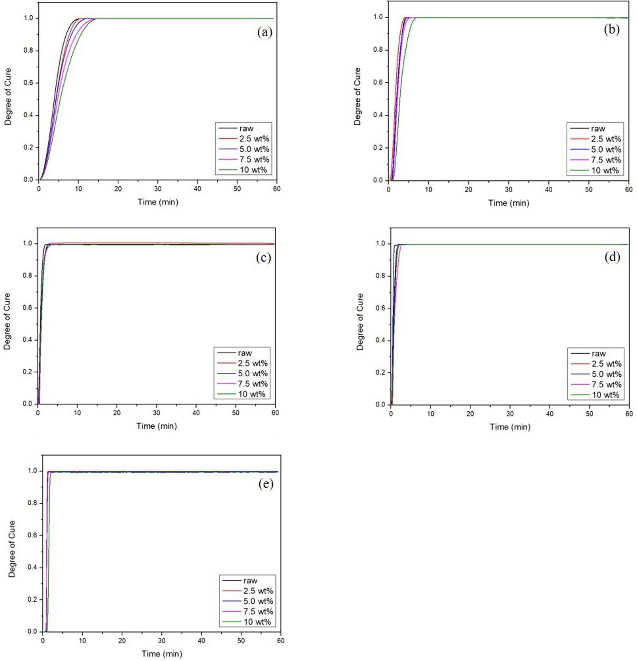 Fig. 7 Degree of cure at different curing temperature with different zirconia content; (a) 140oC, (b) 150oC, (c) 160oC, (d) 170oC, (e) 180oC |