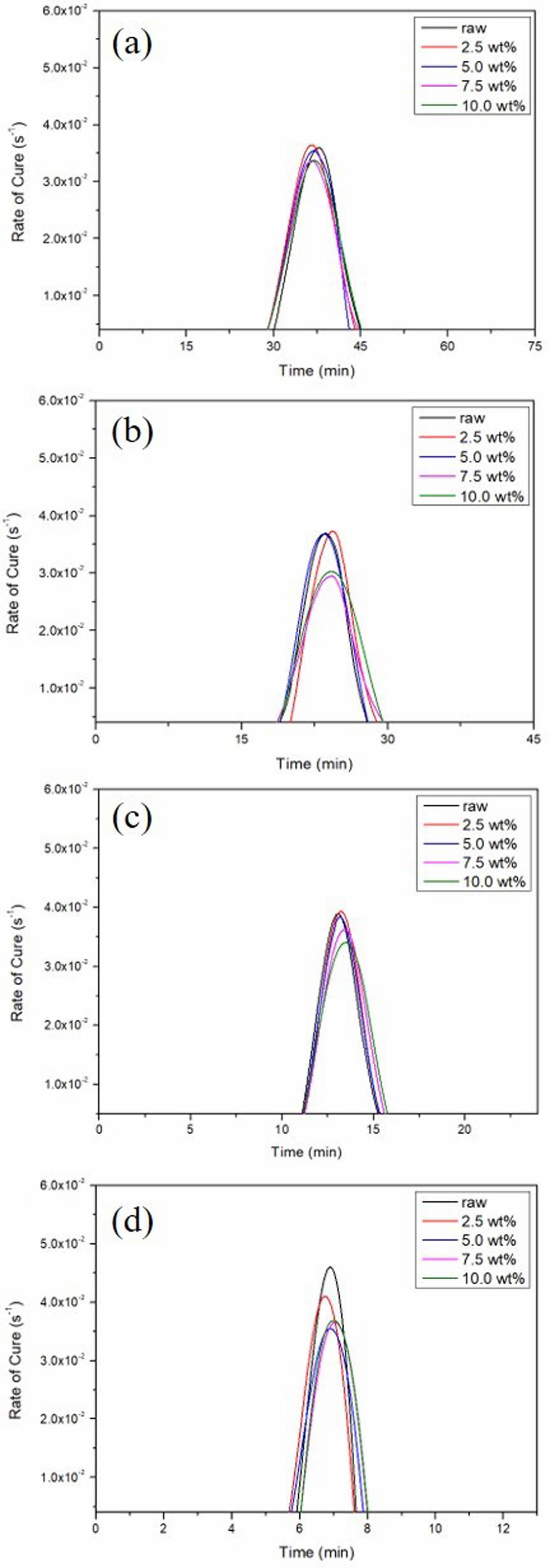 Fig. 4 Rate of cure at different heating rate with different zirconia content; (a) 3oC/min, (b) 5oC/min, (c) 10oC/min, (d) 20oC/min |