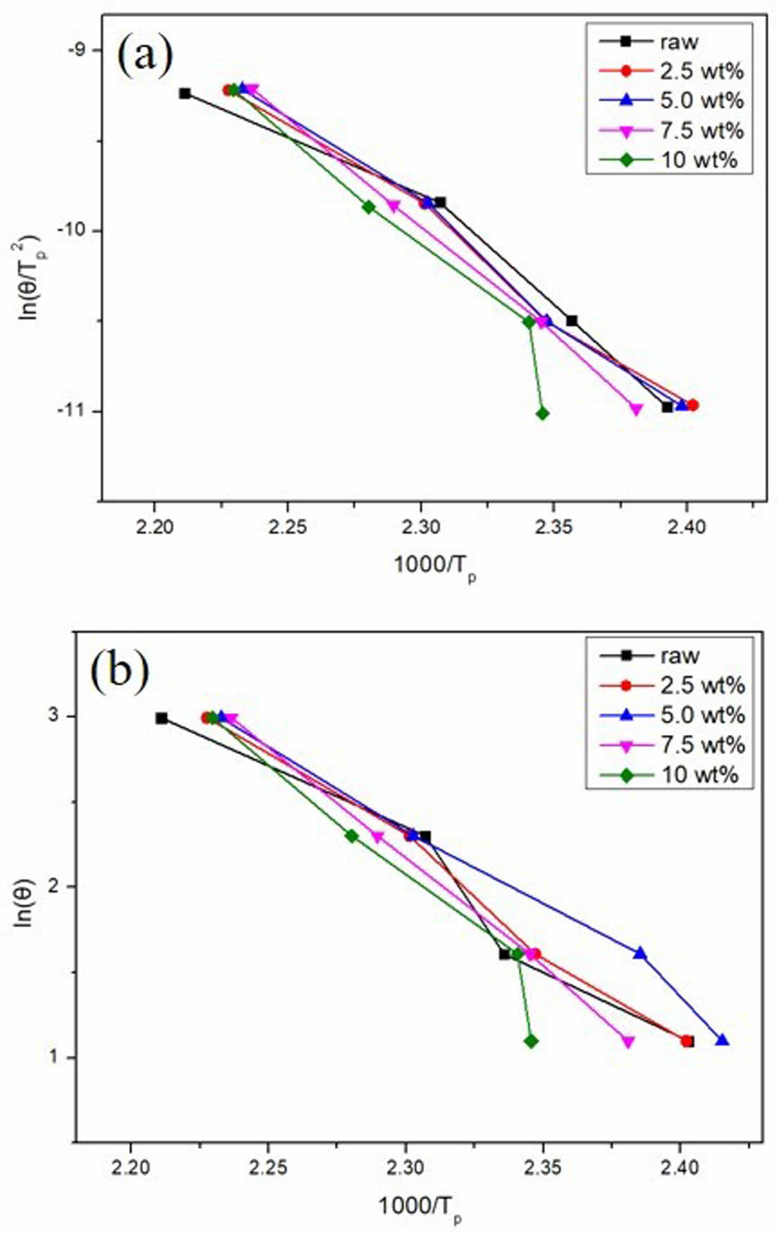Fig. 5 Plots obtained from (a) Kissinger eq. and (b) Ozawa eq. for phenolic resins |
