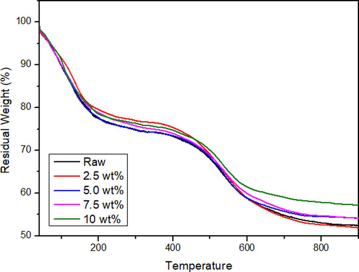 페놀수지에 zirconia를 복합화한 수지의 휘발성분을 확인하기 위해 TGA 분석을 수행하고 그 결과를 Fig. 9에 나타내었다. 가열 초기부터 200oC 부근까지의 중량손실은 잔존 용매와 경화반응 초기에 발생하는 알콜이나 물 등 부반응물의 휘발로 사료된다. 이때 25% 정도의 중량 감소가 관찰되었다. 400oC~800oC에서 관찰되는 중량 감소는 페놀의 분해로, zirconia 첨가량이 증가할수록 분해 종결온도가 높아지는 경향이 관찰되었다. 또한 zirconia의 함량이 증가함에 따라 더 적은 중량 감소를 나타내었다. 이를 통해 수지에 포함된 용매와 초기 부반응물 등의 휘발물질의 함량을 추측할 수 있었으며 zirconia 입자를 페놀수지에 복합화함으로써 더 적은 중량 감소를 일으키는 것을 확인할 수 있었다.