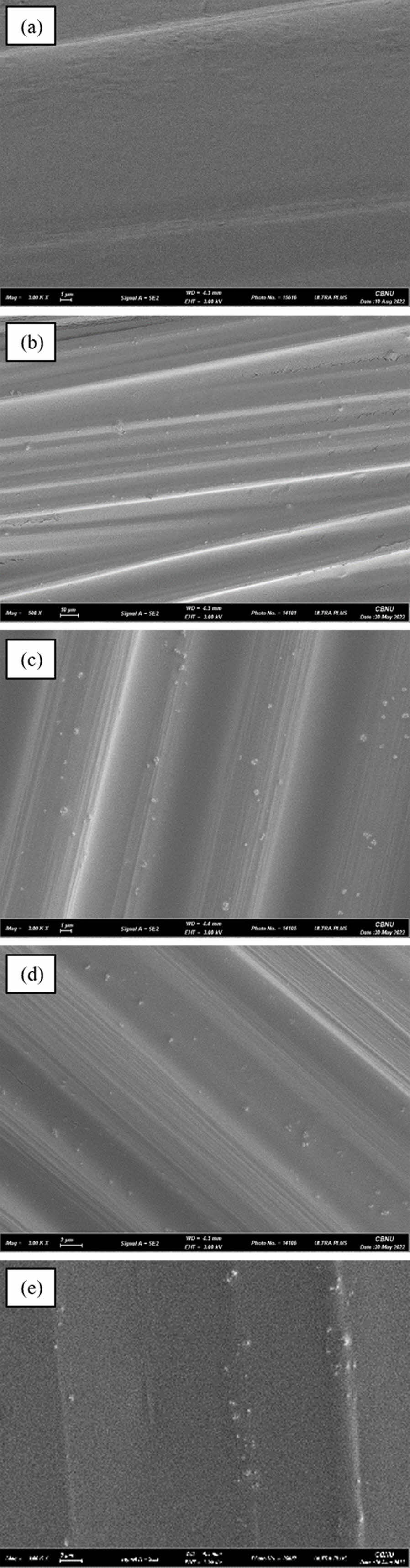 Fig. 10 SEM image of the surface of prepregs prepared with different zirconia content; (a) raw, (b) 2.5 wt%, (c) 5.0 wt%, (d) 7.5 wt%, (e) 10 wt% |