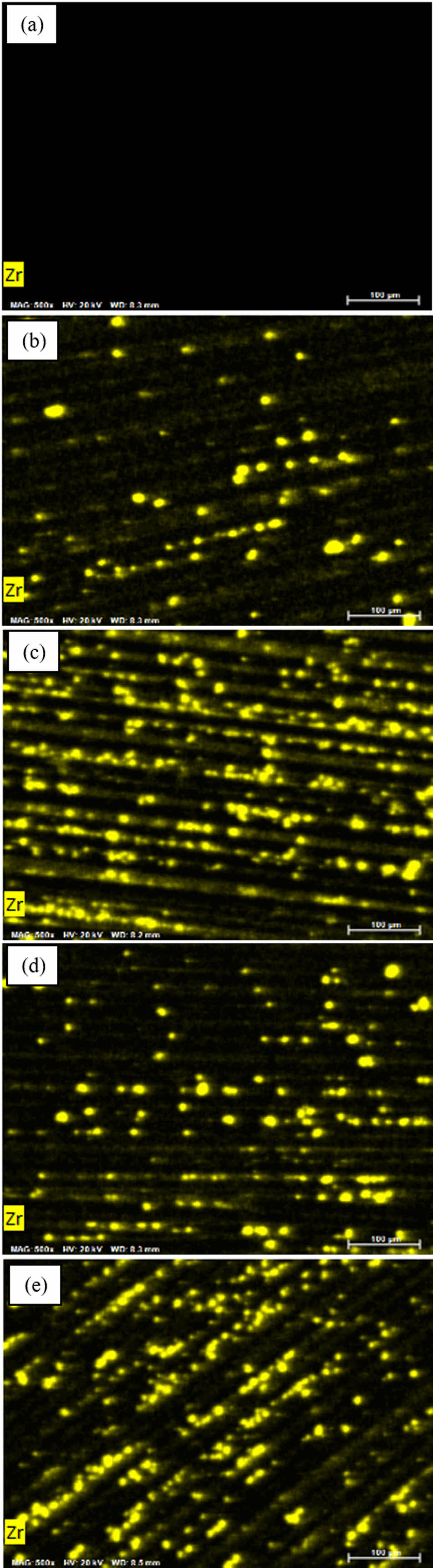 Fig. 11 EDS image of the surface of prepregs prepared with different zirconia content; (a) raw, (b) 2.5 wt%, (c) 5.0 wt%, (d) 7.5 wt%, (e) 10 wt% |