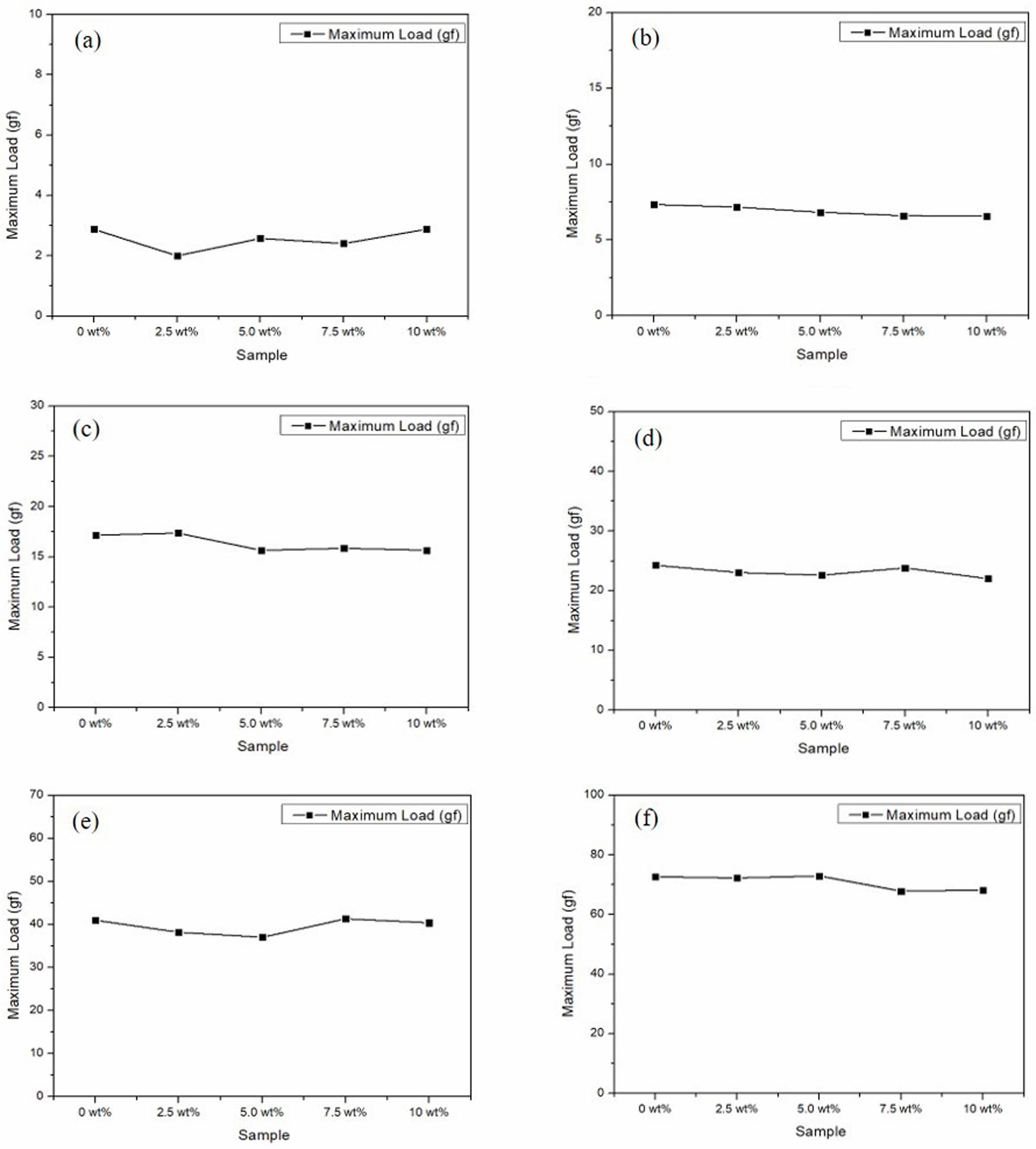 Fig. 12 Maximum load of phenol prepreg tacky test at different bonding force with zirconia content; (a) 1 gf, (b) 5 gf, (c) 10 gf, (d) 30 gf, (e) 50 gf, (f) 100 gf |