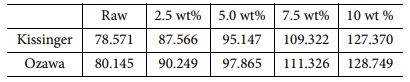 승온속도를 달리하여 DSC를 측정해 얻은 데이터에서 각 최대발열 피크로부터 활성화에너지를 유도할 수 있었다. Kissinger 식 (1) 및 Ozawa 식 (2)을 이용해 계산하였다.