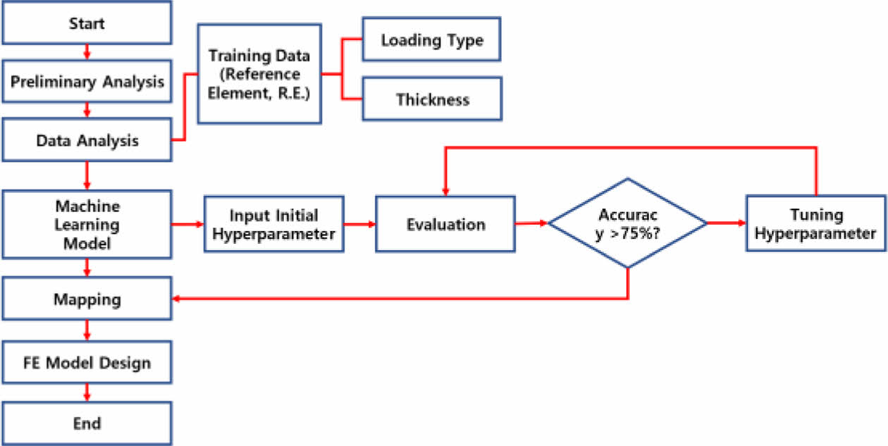 PIC 설계 기법은 하중 유형에 따라 적층 각도 순서를 다르게 하여 최대 지지 하중 및 에너지 흡수율을 높이는 방법이다. FE 모델에서 하중 유형 구간을 효율적으로 나누기 위하여 머신 러닝 알고리즘 중 분류(Classification) 기법이 사용되었다. 분류 기법은 학습데이터를 통해 주어진 데이터를 라벨(Label)별로 구별해내는 과정이며, 다양한 분류 알고리즘으로 학습을 시키고, 머신 러닝 모델을 생성시키는 방법이다[9]. 머신 러닝을 적용하여 PIC 범퍼 빔을 설계하기 위한 플로우 차트는 Fig. 1과 같으며, 우선 학습 데이터의 미가공 데이터(Raw Data)인 응력 삼축 특성값(Stress Triaxiality)을 얻기 위하여 알루미늄 물성이 적용된 IIHS 범퍼 빔 선행 유한요소해석이 진행되었다. 미가공 데이터는 전체 요소 중 일부 요소인 참조 요소(Reference Element)에서 취득된다. 미가공 데이터를 입력값과 라벨로 구성된 학습 데이터로 만들기 위하여, 참조 요소의 좌표 값은 입력값, 응력 삼축 특성값이 하중 유형 데이터로 변환되었다[10].