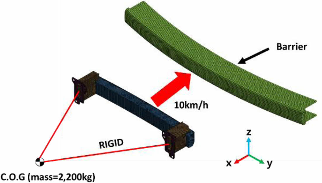 머신 러닝 기법이 PIC 범퍼 빔 설계 방법에 적용되기 위하여 우선적으로 학습 데이터가 생성되어야 한다. 학습 데이터는 선행 유한요소해석을 통해 얻은 결과 값을 기반으로 만들어진다. 선행 유한요소해석 모델은 Fig. 2에 나타난 것처럼 IIHS 범퍼 충돌 해석이며 충돌 속도는 10 km/h이다. 범퍼 빔 모델의 요소 수는 19,000개이며, 참조 요소 수는 전체 요소의 약 12.7%인 2,400개이며 배치는 규칙적으로 이루어졌다.