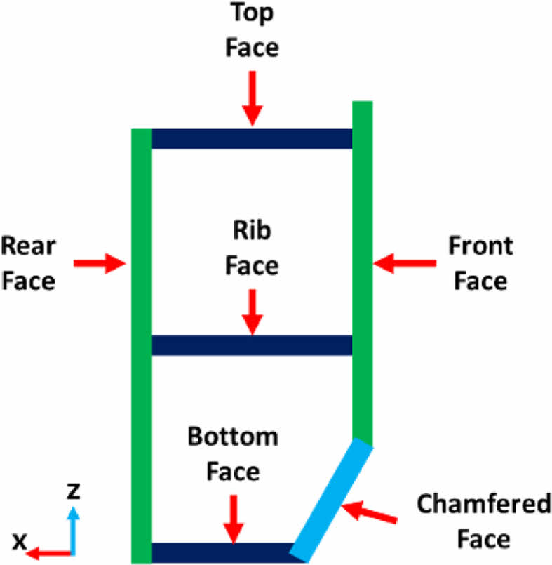 본 연구에서는 참조 요소의 좌표 값이 2D와 3D로 표현되었으며, 2D 표현 방법은 범퍼 빔의 단면을 Fig. 3과 같이, Top Face, Bottom Face, Front Face, Rear Face, Chamfered Face, 그리고 Rib Face로 나누어 각 Face마다의 학습 데이터가 만들어지며, 그에 따라 머신 러닝 모델이 생성된다. 학습 데이터의 입력 값인 참조 요소의 좌표는 (x, y) 형태이며, 각 면의 하중 유형 특성을 잘 드러낼 수 있다는 장점이 있다. 3D 표현 방법은 2D 표현과 같이 면을 나누지 않고 전체 FE 모델에 참조 요소를 배치하여 학습 데이터가 생성되고, 그에 따라 하나의 머신 러닝 모델이 생성된다. 학습 데이터의 입력 값은 (x, y, z)로 나타나게 되며, 하나의 머신 러닝 모델을 이용하기 때문에 계산 시간을 줄일 수 있다는 장점이 있다.