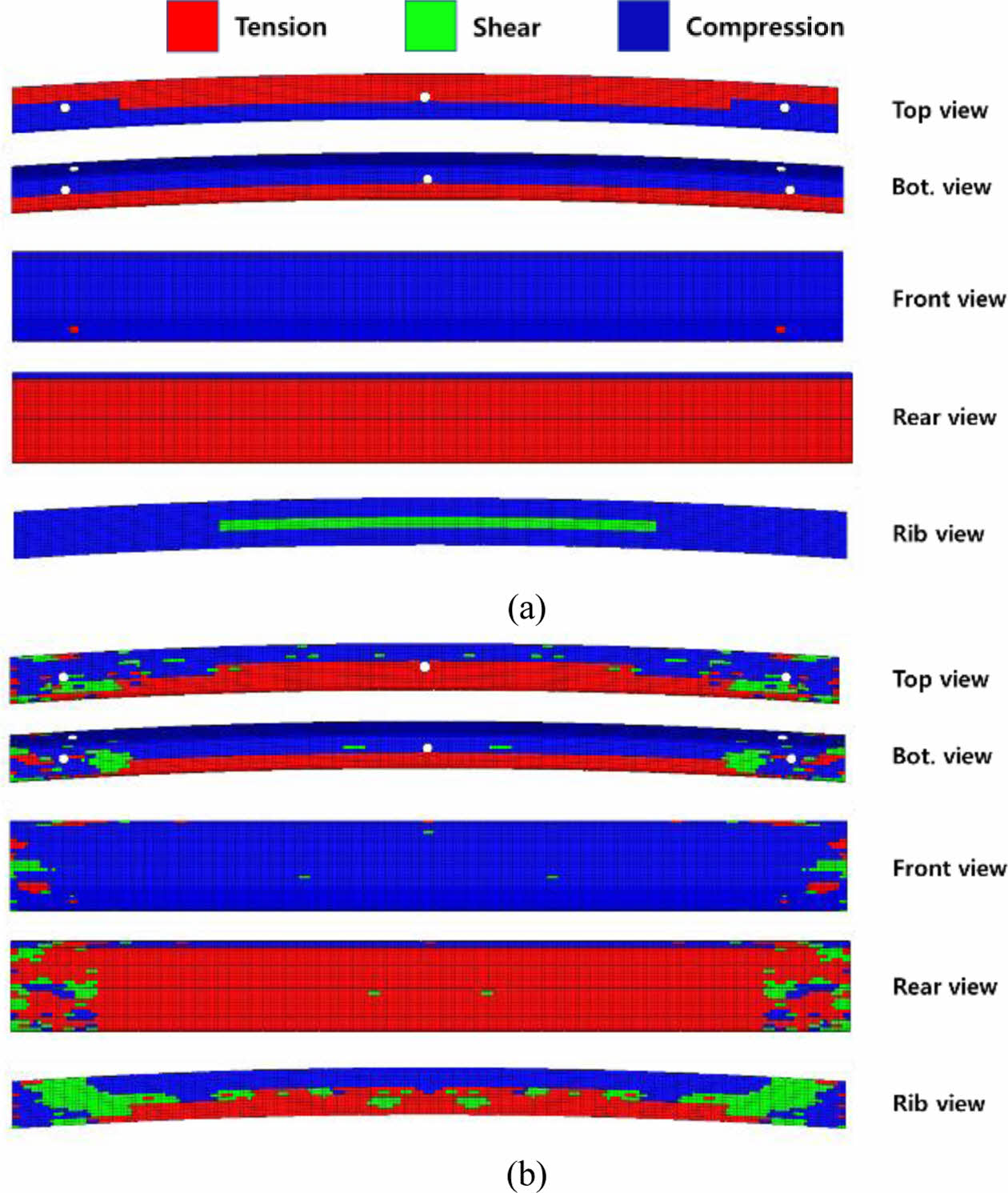 머신 러닝 기법이 적용된 범퍼 빔의 강도 향상을 검증하기 위하여 단일 적층 순서(Uni Stacking Sequence)로 모델링 된 범퍼 빔이 PIC를 통해 모델링 된 범퍼 빔과 비교되었다. 선행 유한요소해석과 동일한 조건의 해석이 진행되었다. 해당 범퍼 빔에 적용된 재료는 T700 Carbon fibre/2510이다[16]. 각 하중 유형에 대하여 강도가 높다고 알려진 적층 각도 순서는 Table 3에 나타나져 있으며, 해당 적층 각도 순서들은 하중 유형별로 매핑 된 요소에 적용되었다[17].