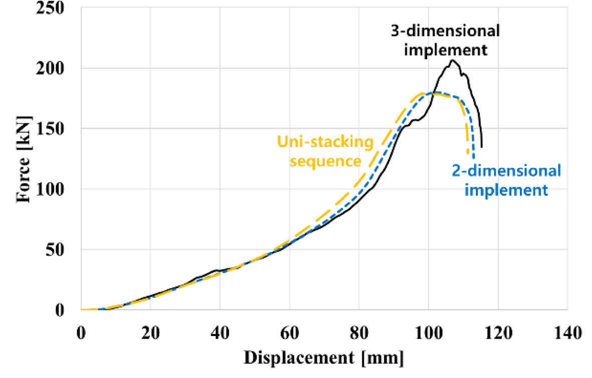 해석 결과는 Fig. 5와 같이 Force-Displacement 선도로 나타냈으며, 3D 표현 방법으로 설계된 범퍼 빔의 최대 지지 하중은 약 206.2 kN으로 가장 높게 나타났고 2D 설계 기법과 단일 적층 순서로 모델링 된 범퍼 빔 보다 각각 약 12.7%, 약 13.1% 높게 나타났다.