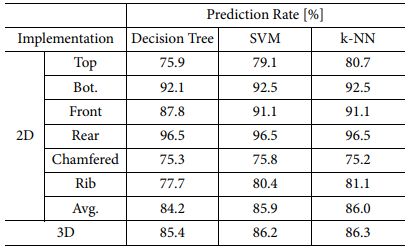 2D 표현 방법에서는 k-NN 분류 모델이 가장 우수한 성능으로 나타났으며, 3D 표현 방법 또한 k-NN 분류 모델이 가장 우수한 성능으로 나타났다. 2D 표현 방법과 3D 표현 방법의 성능을 비교하기 위하여, 2D 표현 방법을 이용한 머신 러닝 모델 평균 예측률과 3D 표현 방법을 이용한 머신 러닝의 예측률이 비교되었으며, 3D 표현 방법이 근소한 차이로 높은 성능으로 나타났다.