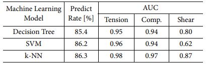 본 연구에서는 머신 러닝 알고리즘 중 Decision tree, SVM(Support Vector Machine) 그리고 k-NN 알고리즘 등이 있다. 각 알고리즘들은 고유의 하이퍼파라미터(Hyperparameter)를 가지고 있으며, 하이퍼파라미터에 의해 모델의 성능이 결정된다고 알려져 있다[11]. 머신 러닝 알고리즘은 학습 데이터를 통해 학습시키게 되면 머신 러닝 모델이 생성되며, 모델의 성능은 예측률과 ROC(Receiver Operation Characteristic)의 AUC(Area Under the Curve)를 통해 확인될 수 있으며, 예측률이 75% 이하일 경우, 하이퍼파라미터 튜닝을 통해 예측률을 75% 이상의 성능이 도출될 수 있도록 하였다.
