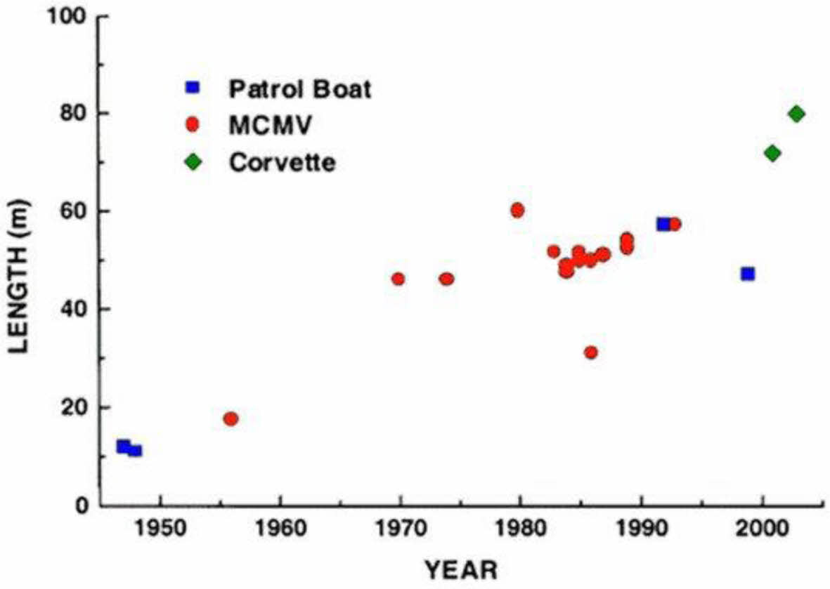 Fig. 1 Plot of vessel length against the year of construction for all-composite patrol boats, mine-countermeasures vessels (MCMVs) and corvettes against the year of construction [3] |