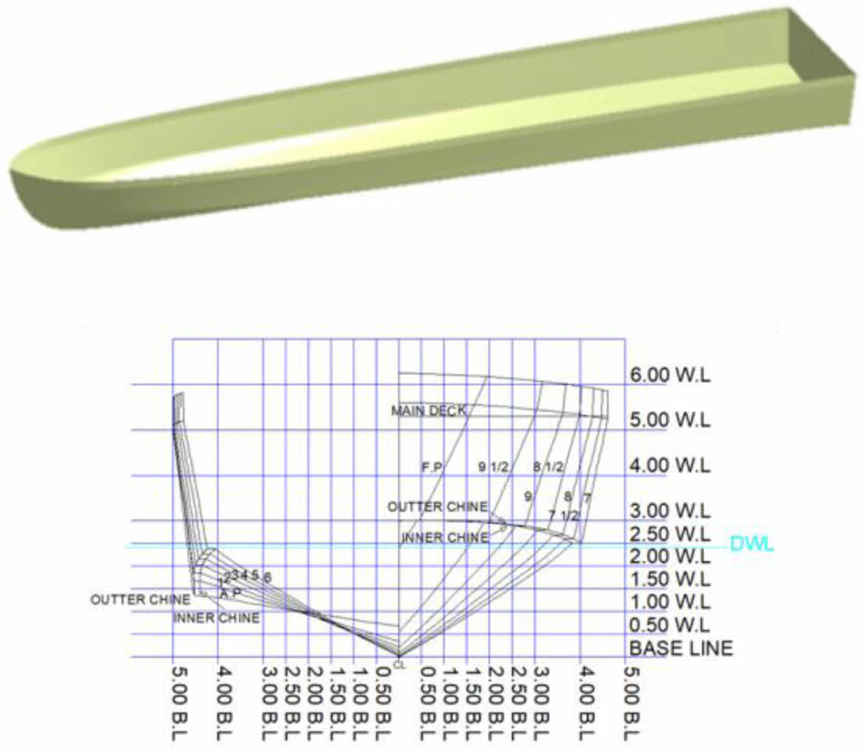 CFRP 설계함의 선형을 도출하기 위하여 유사 실적 경비함 중 CFRP 소재로 건조된 비스비(Visby)의 선형을 참고해 본 설계함의 선형설계를 진행하였다. 이 때 비스비 선형을 상용소프트웨어로 활용하여 구현하였고, Maxsurf 소프트웨어[29]를 활용하여 앞서 도출된 CFRP 설계함의 주요 치수와 맞게 선형 변환을 하고 3D 모델을 도출하였다. Fig. 4은 도출된 CFRP 경비함의 선형과 선도(정면도)이며 Table 3은 CFRP 경비함의 선형의 주요치수이다.