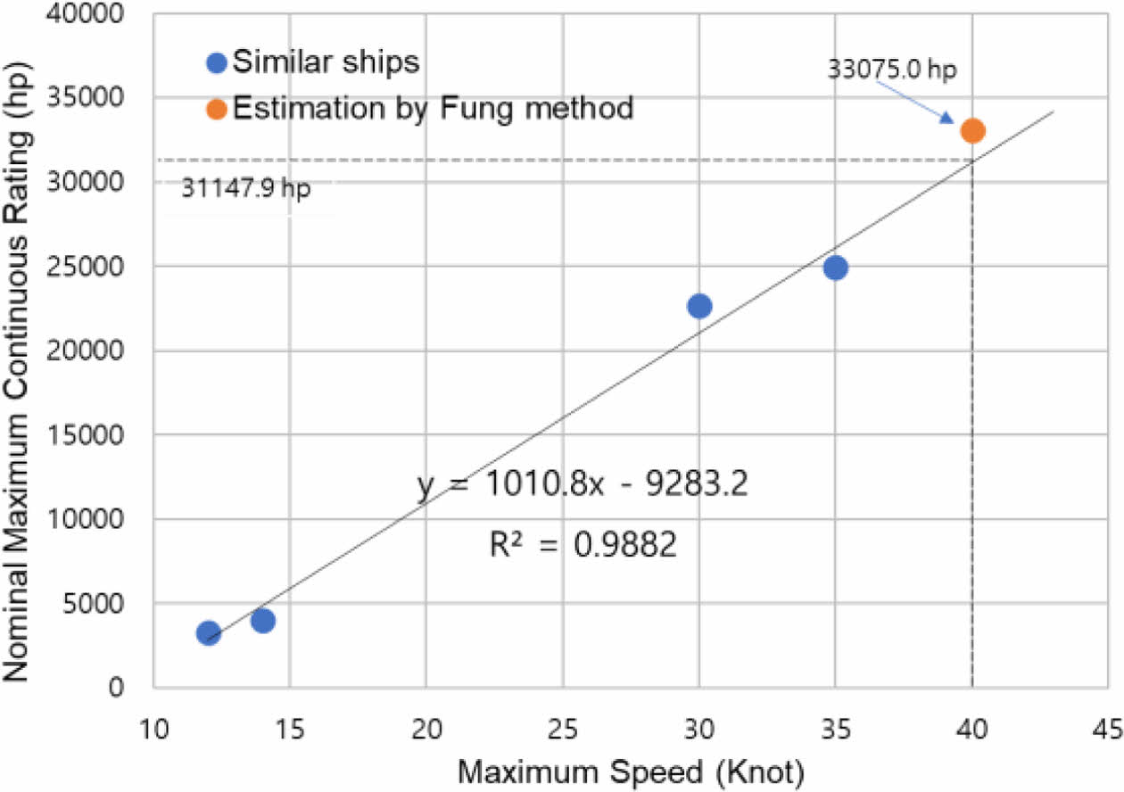 CFRP 설계함의 요구 속력을 충족시키기 위한 엔진의 선택과 이를 포함하여 선형의 loading-condition에 따른 무게를 추정하였다.최대 요구 속력을 충족시키기 위한 엔진의 출력 추정은 설계함의 선형특징과 주요제원의 요구사항을 고려하여 Maxsurf Resistance[29]를 이용하여 Fung 알고리즘을 통해 추정하였다. 추정된 속력변화에 따른 유효 마력(efficiency horse power, EHP)의 결과 40 knots일 때 최소 15,902 hp가 필요한 것으로 확인되었다. 또한, 추정된 유효 마력을 통해 추진기, 전동축 등에 의한 손실율과 sea margin과 engine margin 등을 고려하여 최대속력 40 knots일 때 엔진의 최대 연속 상용 출력(33,075 hp)을 도출하였다. 또한 앞서 조사한 유사 실적 경비함의 최대 연속출력과 같이 비교 분석하였으며 매우 유사한 결과로 보이고 있음으로 추정된 최대연속 추력은 합리적이라고 판단된다(Fig. 5).