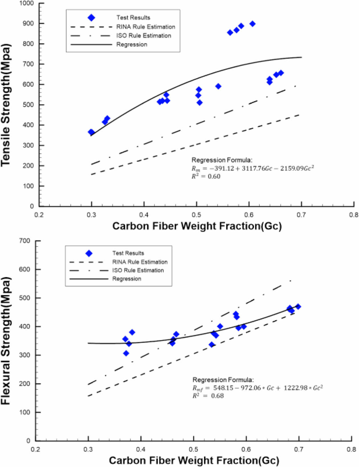 해양용 복합소재가 되기 위해 강화재의 중량의 비율 (glass fiber weight fraction, Gc, 함침율)이 최소 0.30 이상이 되어야 해양구조물로써 유효하다. 위와 같은 선급규정에서는 Gc 변화에 따른 적층판의 물성 추정식을 제시하고 있으며, 또한 선체에 사용할 소재의 직접적인 실험결과를 활용하여도 된다.