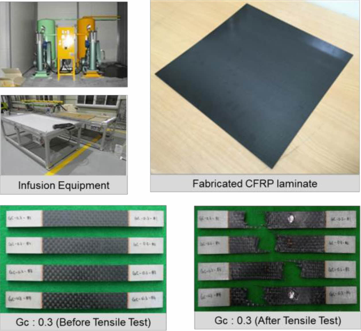 Fig. 8 CFRP laminate specimen fabrication and tensile test examples (the case of 30% carbon fiber woven roving) [22] |
