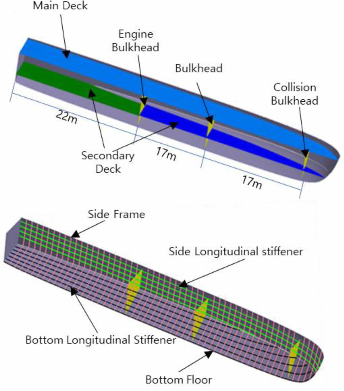 앞서 도출된 선형에 구획과 보강재 배치를 포함하는 구조배치를 하였다. RINA 선급규정에 따라 엔진, 연료 및 청수 탱크 등을 고려하여 수밀격벽을 배치하였으며, 자세한 배치 결과는 Fig. 9와 같다. 전반적인 구조설계는 RINA 선급규정에 따랐으며, 상세한 설계과정은 [16,21]의 설계프로세스를 참고하였다. 본 논문에서는 최대 충격하중이 작용할 것으로 예상되는 선저판을 중심으로 CFRP 구조설계의 결과를 설명하였다.