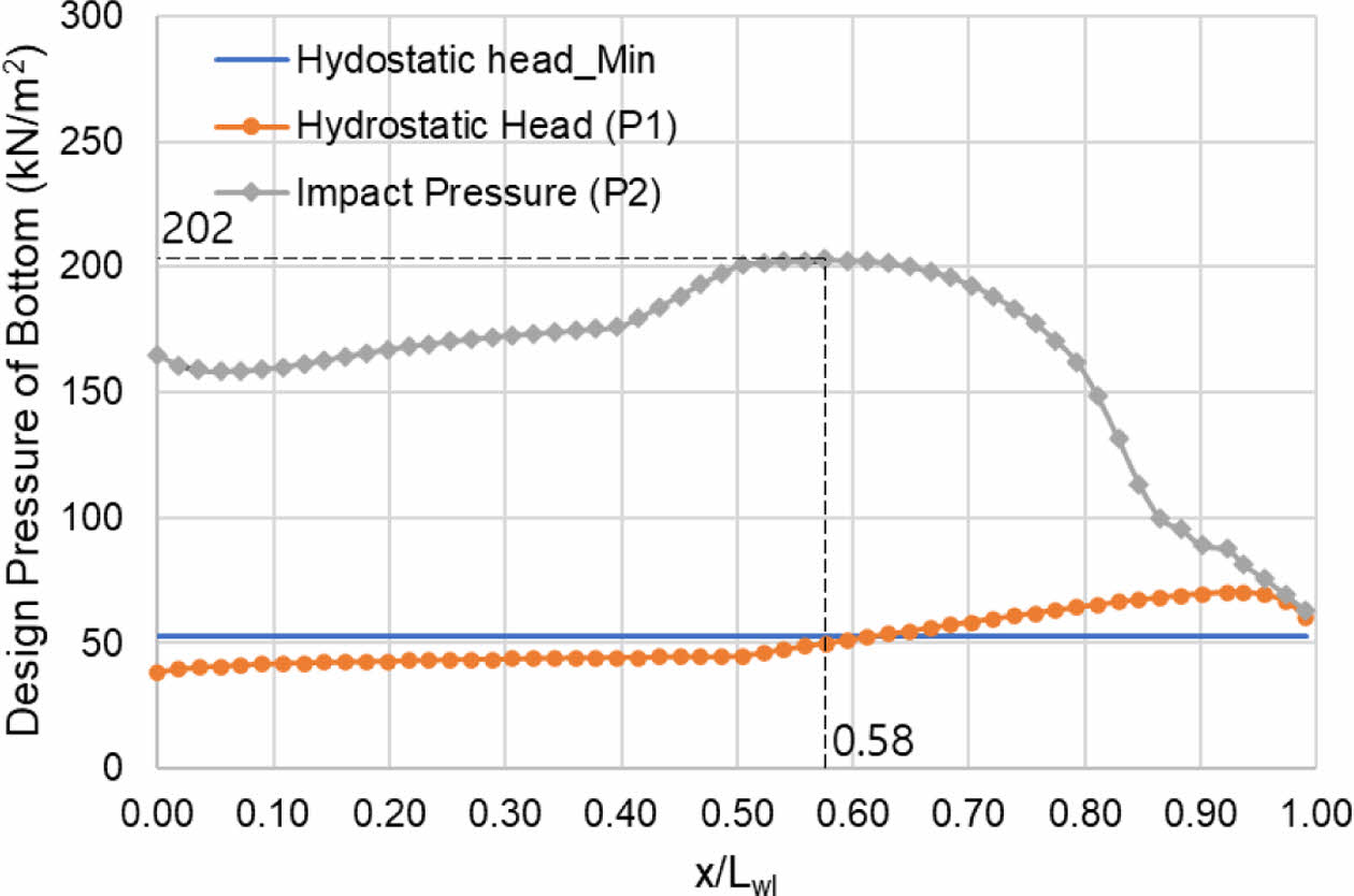 우선, 선형에 작용하는 설계하중을 추정하기 위해서는 최대속력 40 knots를 적용하였고, RINA 선급규정에서 활주형에 해당되는 추정식에 식 (2)와 (3)[20]에 따라 선형에 작용하는 수두압(hydrostatic head, P1)와 충격하중(impact pressure, P2)를 추정하였다. Fig. 10은 선저판의 설계하중의 추정 결과이며 최대 하중은 0.5Lwl 앞부분에서 202 kN/m2의 충격하중이 작용하는 것으로 계산되었다.
