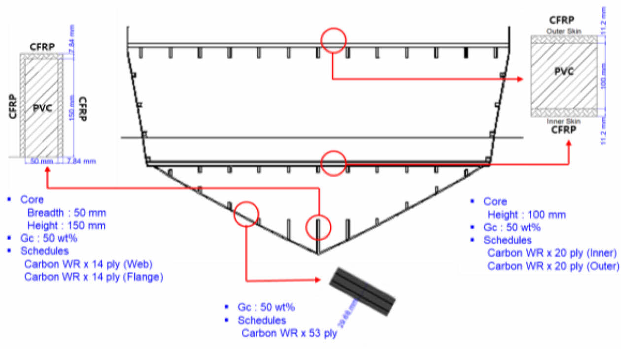 지금까지 최대 하중을 받는 선저판의 CFRP 적층판 설계 중심으로 설명하였으며, 이와 동일한 방법으로 선측판, 갑판, 격벽, 상부구조 물 등의 구조와 PVC의 코어재를 포함하는 보강재 설계 또한 실시하였으며, 이 CFRP 선체구조의 설계 결과는 Table 8에 요약하였다. 또 선저판, 선측판, 가판, 보강재 등 구조재의 설계결과는 Fig. 11에서 보이고 있다. 이 설계자료는 선체 무게 추정할 때 다시 사용된다.