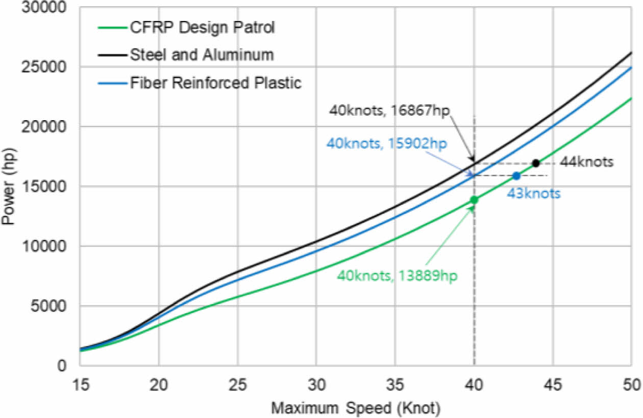 기존 조사된 강 및 알루미늄 실적함은 595.6 ton, FRP 복합소재 실적함이 561.1 ton으로 확인되고 있다. 항해 범위가 2000 NM의 설계조건을 만족할 때의 CFRP 설계함의 배수량이 443.4 ton이다. 이를 바탕으로 배수량 차이로 인한 흘수 변화를 고려하여 앞서 사용된 Fung 방법을 통해 강 및 알루미늄, 복합소재, CFRP 설계함 3가지 케이스를 고려해 최대속력 40 knot로 운항할 때 발생하는 저항과 요구되는 유효 마력을 추정하였다.