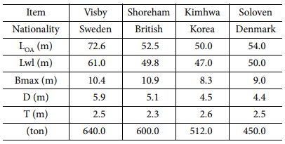 앞서 정의된 CFRP 경비함의 기본요구사항과 조사된 유사한 FRP 복합소재의 경비함 중 설계정보가 상대적으로 상세하게 제공하고 있는 4척의 유사 실적 경비함(Fig. 3)의 정보를 상세히 분석하였다.